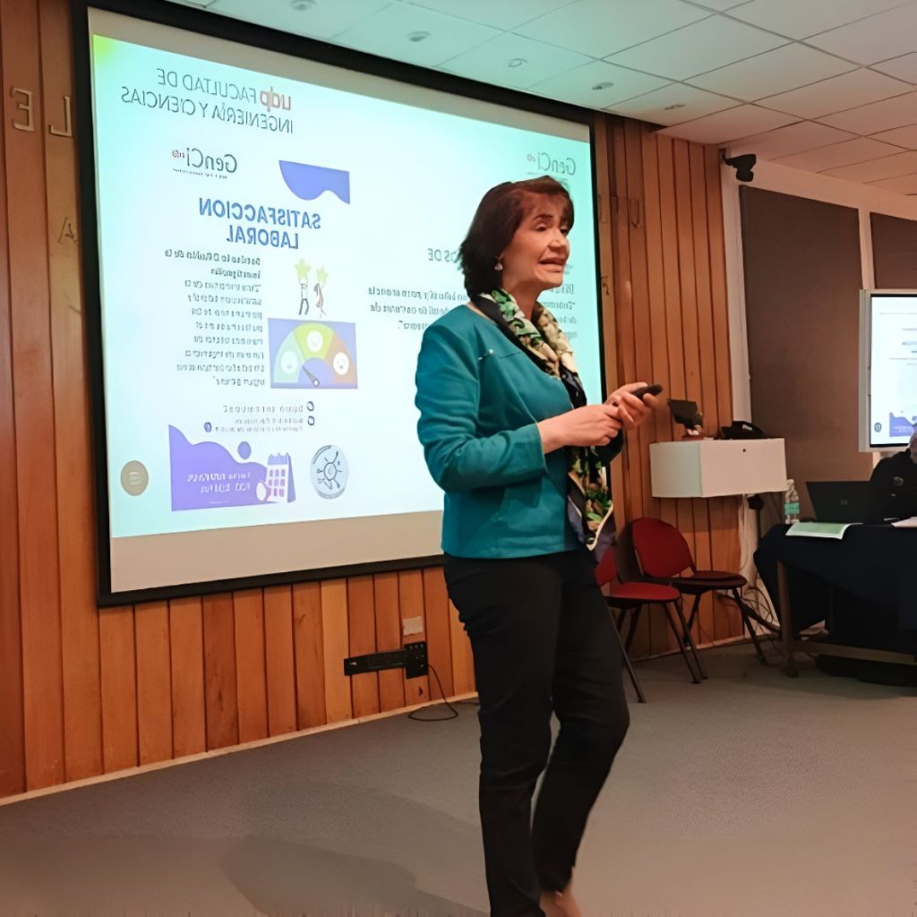 La actividad estuvo a cargo de la académica e investigadora Sara Arancibia Carvajal, acompañada por la profesional ingeniera civil industrial Brenda Sepúlveda Alarcón, quienes presentaron los principales resultados en el Auditorio de la Facultad de Ingeniería y Ciencias de la UDP. La exposición se enfocó en analizar los factores que inciden en la satisfacción y permanencia de las y los profesionales del ámbito de la ingeniería, considerando las diferencias por género y rangos etarios.